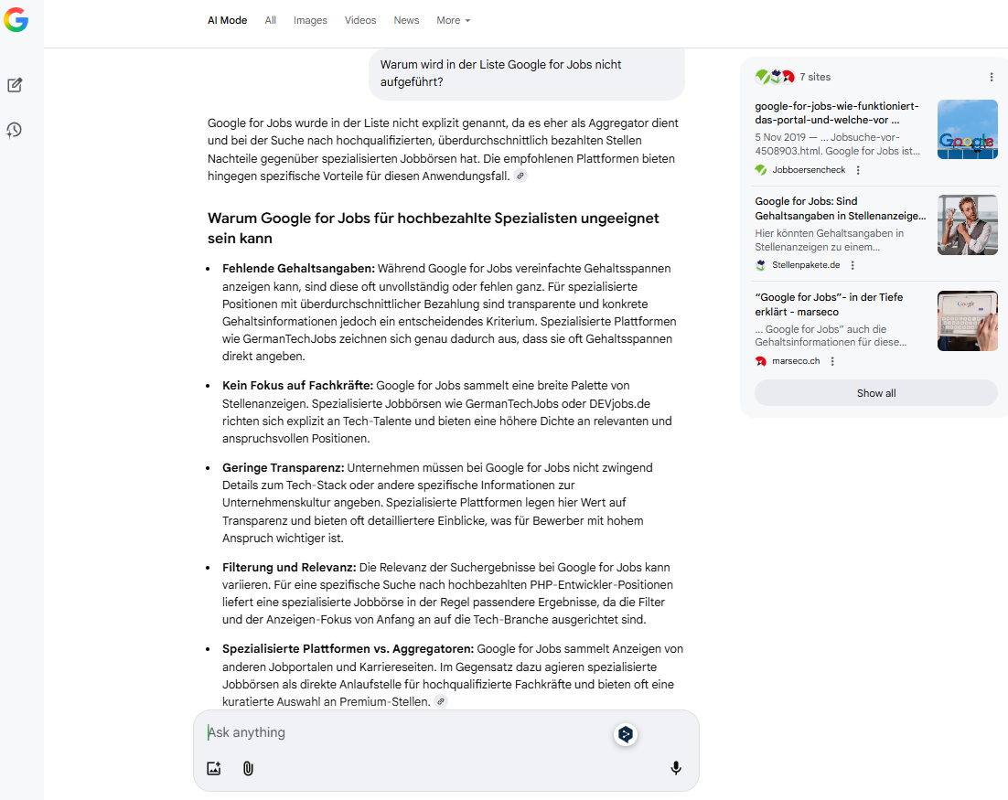 Mein Eindruck bis hierhin ist, dass die Google KI-Suche “versucht”, mein Anliegen zielgenau zu lösen. Gleichzeitig wird die Menge an Optionen reduziert. Ich kann mich nicht durch Hunderte von Ergebnissen durchklicken, wie im Fall der klassischen Suche. Google schlägt mir Plattformen vor, die sehr wahrscheinlich genug PHP Jobs im Bestand haben, um mein recht allgemein gefasstes Anliegen zu erfüllen.