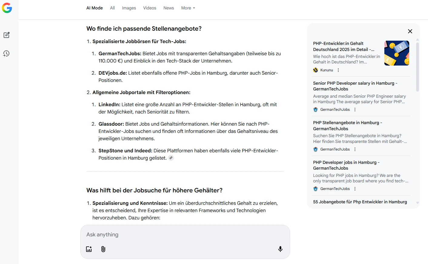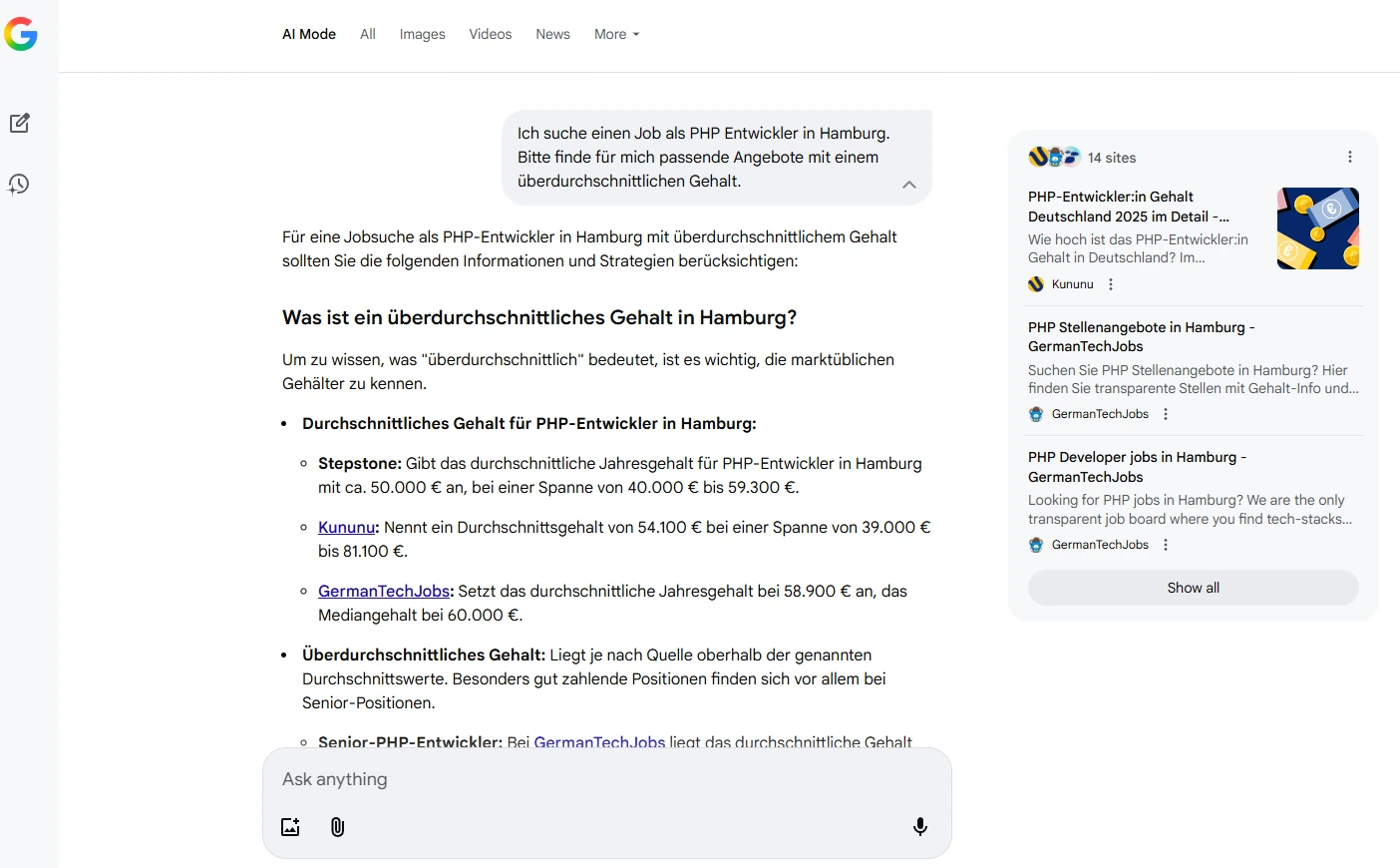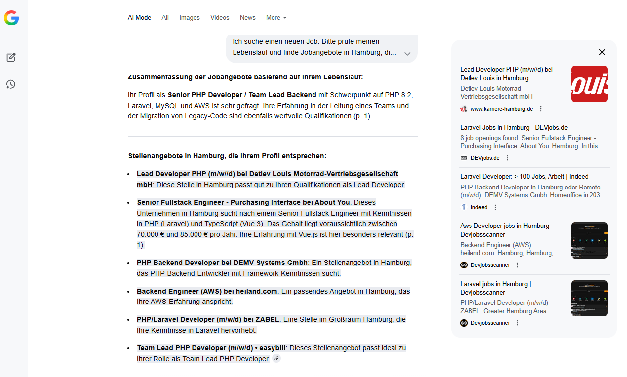 Ich starte die Suche mir der Formulierung: “Ich suche einen Job als PHP Entwickler in Hamburg. Bitte finde für mich passende Angebote mit einem überdurchschnittlichen Gehalt.”