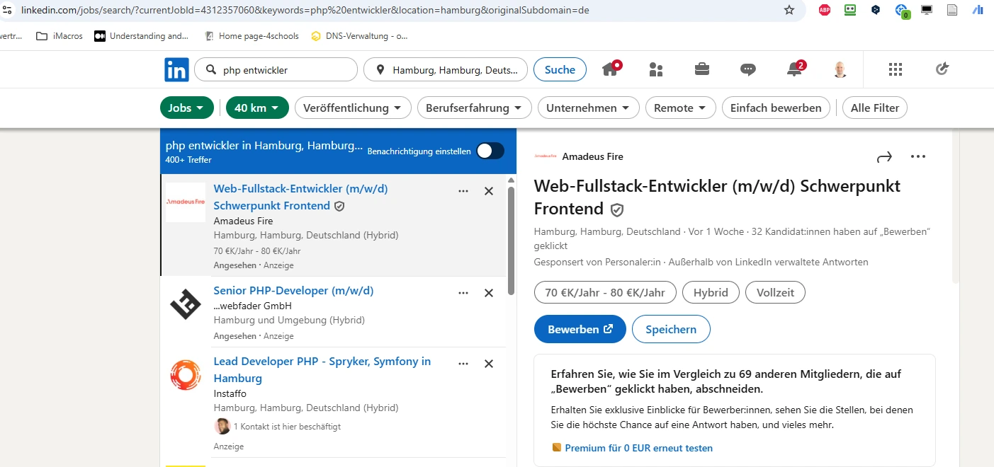 Über die Links in der rechten Sidebar kann ich direkt zu den entsprechenden Plattformen gelangen. Nicht alle Links führen zu Jobs. Manche führen zu Seiten mit Gehaltsbenchmarks. Aber im Großen und Ganzen finde ich schnell einige PHP Jobs aus Hamburg.
