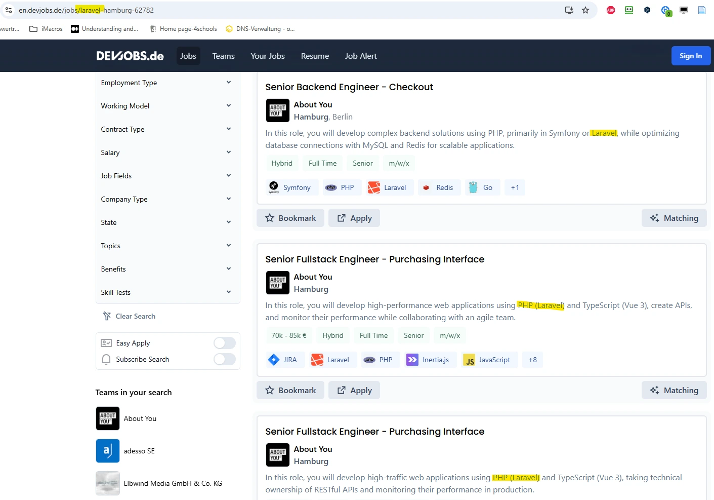 Zusätzlich erhalte ich wieder eine Liste mit größeren Plattformen in der Sidebar. Beim Klick auf die Links erhält man eine passende Vorauswahl – in diesem Fall PHP Laravel Jobs. Das ist ziemlich praktisch.