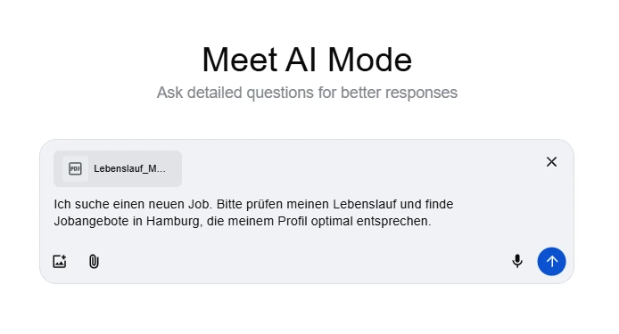 Wann genau wir alle umsteigen und wie die Zukunft der Jobbörsen sich dadurch verändert, ist aus meiner Sicht heute gar nicht so relevant und auch schwer vorherzusagen. Wir können und sollten uns allerdings aktiv mit der Veränderung beschäftigen. Wie funktioniert die Google KI-Suche für die Jobsuche heute? Ich habe zwei kleine Experimente gemacht.